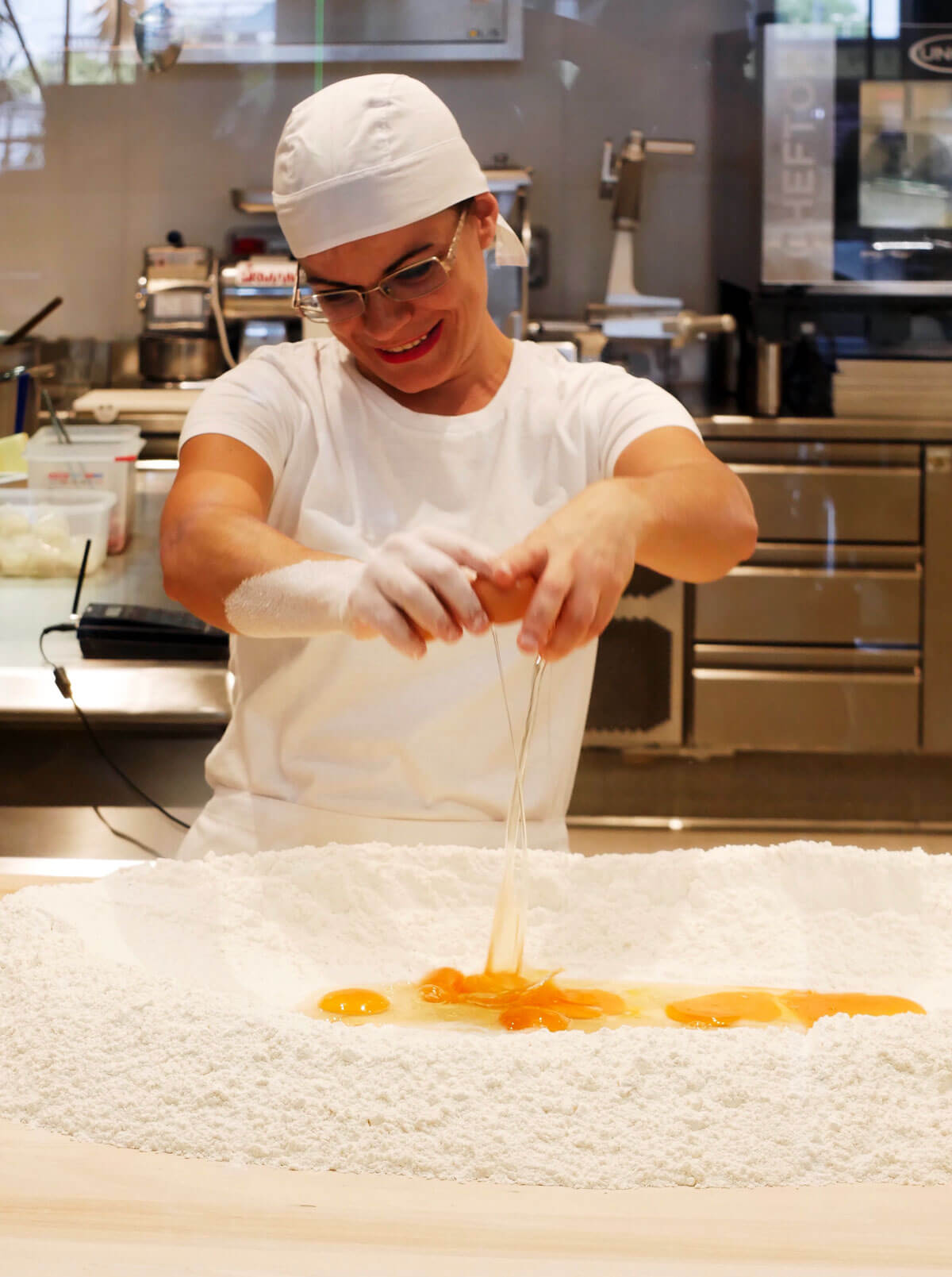 Quello che rimane caratterizzante e ha un fascino incredibile è vedere la sfoglina all’opera. Anche se noi emiliani abbiamo la fortuna di esserci abituati, quel gesto di preparazione rimane un qualcosa di magico, che tutte le volte riesce a sorprendermi. Le nostre nonne ce l’hanno resa una pratica famigliare e noi tutte le volte che lo vediamo fare torniamo sempre un po’ bambini! Però, devo dire che vedere impastare 50 uova non è proprio da tutti 🙂